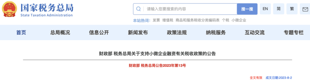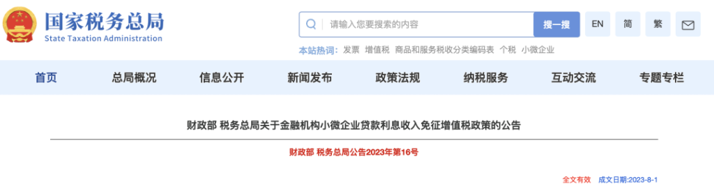 六、金融机构向小型企业、微型企业及个体工商户发放单户授信小于100万元(含本数),或者没有授信额度,单户贷款合同金额且贷款余额在100万元(含本数)以下的贷款取得的利息收入,可按照《财政部税务总局关于支持小微企业融资有关税收政策的公告》(财政部税务总局公告2023年第13号)的规定免征增值税。