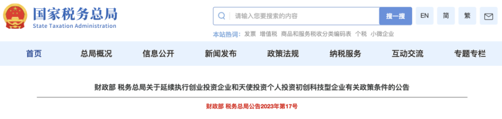 为进一步支持创业创新,现就创业投资企业和天使投资个人投资初创科技型企业有关税收政策事项公告如下:对于初创科技型企业需符合的条件,从业人数继续按不超过300人、资产总额和年销售收入按均不超过5000万元执行,《财政部 税务总局关于创业投资企业和天使投资个人有关税收政策的通知》(财税〔2018〕55号)规定的其他条件不变。在此期间已投资满2年及新发生的投资,可按财税〔2018〕55号文件和本公告规定适用有关税收政策。本公告执行至2027年12月31日。