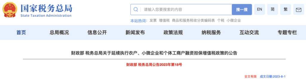 为进一步支持农户、小微企业和个体工商户融资,现将有关税收政策公告如下:一、纳税人为农户、小型企业、微型企业及个体工商户借款、发行债券提供融资担保取得的担保费收入,以及为上述融资担保(以下称原担保)提供再担保取得的再担保费收入,免征增值税再担保合同对应多个原担保合同的,原担保合同应全部适用免征增值税政策。否则,再担保合同应按规定缴纳增值税。二、本公告所称农户,是指长期(一年以上)居住在乡镇(不包括城关镇)行政管理区域内的住户,还包括长期居住在城关镇所辖行政村范围内的住户和户口不在本地而在本地居住一年以上的住户,国有农场的职工。位于乡镇(不包括城关镇)行政管理区域内和在城关镇所辖行政村范围内的国有经济的机关、团体、学校、企事业单位的集体户;有本地户口,但举家外出谋生一年以上的住户,无论是否保留承包耕地均不属于农户。农户以户为统计单位,既可以从事农业生产经营,也可以从事非农业生产经营。农户担保、再担保的判定应以原担保生效时的被担保人是否属于农户为准。本公告所称小型企业、微型企业,是指符合《中小企业划型标准规定》(工信部联企业〔2011〕300号)的小型企业和微型企业。其中,资产总额和从业人员指标均以原担保生效时的实际状态确定;营业收入指标以原担保生效前12个自然月的累计数确定,不满12个自然月的,按照以下公式计算:营业收入(年)=企业实际存续期间营业收入/企业实际存续月数×12纳税人应将相关免税证明材料留存备查,单独核算符合免税条件的融资担保费和再担保费收入,按现行规定向主管税务机关办理纳税申报;未单独核算的,不得免征增值税