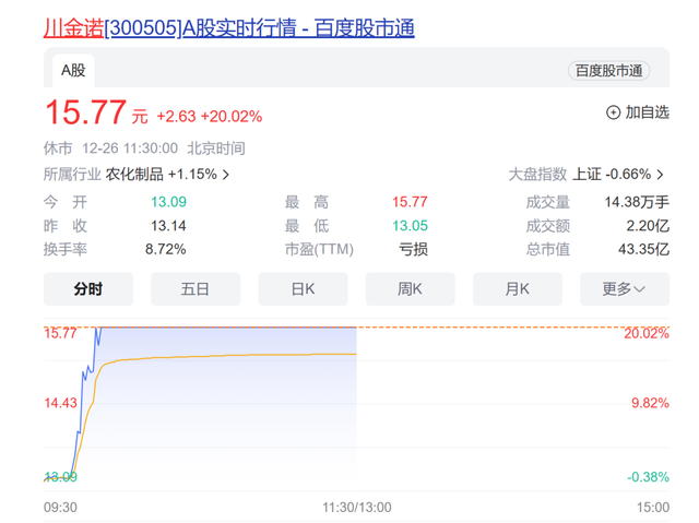 农化股早间集体走强,其中化肥板块盘中一度放量直线拉升涨逾2%,半日成交超昨日全天成交。川金诺(15.770, 2.63, 20.02%)仅用不到10分钟的时间,股价就由从平盘附近直拉到20%涨停;蔚蓝生物(16.600, 1.51, 10.01%)则在昨日涨停的基础上,今日开盘一字涨停;湖北宜化(9.870, 0.90, 10.03%)等亦开始封涨停。