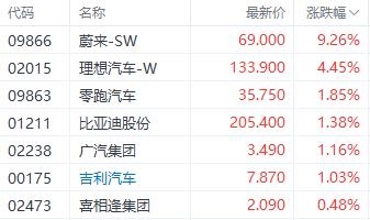 财联社12月27日讯(编辑 胡家荣)受益于市场多重利好,港股汽车股今日出现反弹。截至发稿,蔚来、理想汽车、零跑汽车(09863.HK)、比亚迪(191.450, -0.30, -0.16%)股份(01211.HK)分别上涨9.26%、4.45%、1.38%。