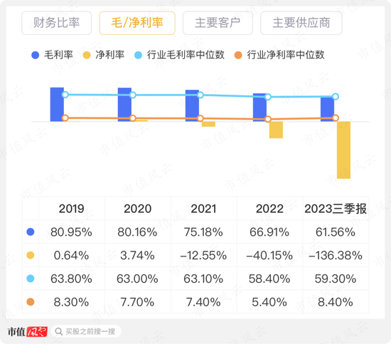 毛利率持续下滑,研发费用率不断上升,一降一升,毛利率已经无法覆盖研发费用率,公司净利率也从2021年开始持续为负。