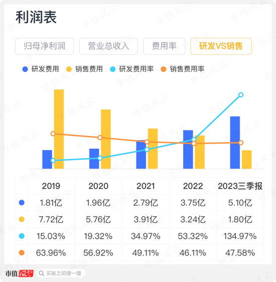 同时,研发费用率也从2018年的12.9%上升至了2022年的53.3%,以及2023年前三季度的135%。