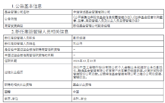 12月25日,中信保诚基金发布高级管理人员变更公告,新任刘业伟为副总经理,任职日期2023年12月22日。