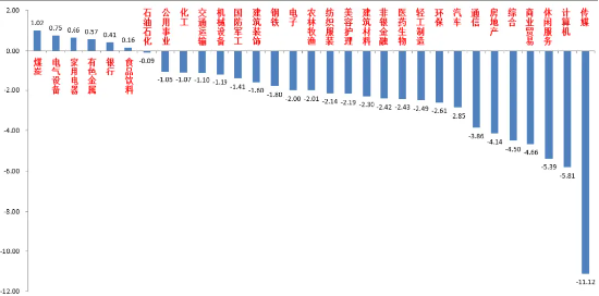 31个申万一级行业中,煤炭(1.02%)、电气设备(0.75%)和家用电器(0.66%)居涨幅前三。传媒(-11.12%)、计算机(-5.81%)和休闲服务(-5.39)居跌幅前三。