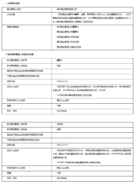 近日,南华基金发布2023年行业高级管理人员变更公告,董事长张哲因个人原因离任,任职时长1年5月。总经理朱坚转任董事长,副总经理曾媛升任总经理、任职日期2023-12-21。