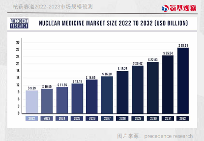 随着Pluvicto的销售额持续上涨,市场对于核药的预期也不断走高。据第三方调研机构precedence research预测,2022年全球核医学市场规模为95.9亿美金,2032年这一数字将超过286.1亿美金。