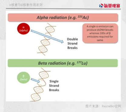 RYZ101则选择了α粒子放射性同位素锕-225作为核素。与β粒子相比,α粒子可以提供比β粒子高400倍的能量,导致更频繁的双链 DNA 断裂,从而杀灭肿瘤细胞。