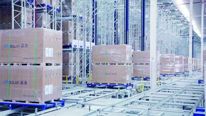 从晶澳义乌基地一栋厂房外的步梯走上二层,进门后是一个小型平台,站在平台上向下方望去,眼前豁然开朗——只见一排排有两三层楼高的钢结构仓储货架在厂房内“顶天立地”,带来强烈的视觉冲击。货架上摆放着一个个打包完整的木箱。每个货架编着号码,边上还有堆垛机上下左右移动,货叉将木箱从货架的不同区域搬运到下方的传输带上。