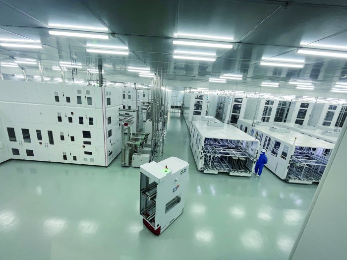 记者又来到位于安徽芜湖湾沚区的协鑫集成(2.5300.000.00%)芜湖基地,看到了类似的一幕。这座今年2月刚刚动工、10月就实现全面达产的20吉瓦高效N型TOPcon电池片制造项目使用当前最先进的自动化电池片生产设备,要打造规模化、数字化、智能化为一体的高效光伏电池研发制造基地。只见整个车间内,一台台制绒、碱式抛光、硼扩散、磷扩散、正镀膜、背镀膜、丝网印刷等设备排列成一个个“方阵”,几台AGV小车在各个生产线间自动往来。