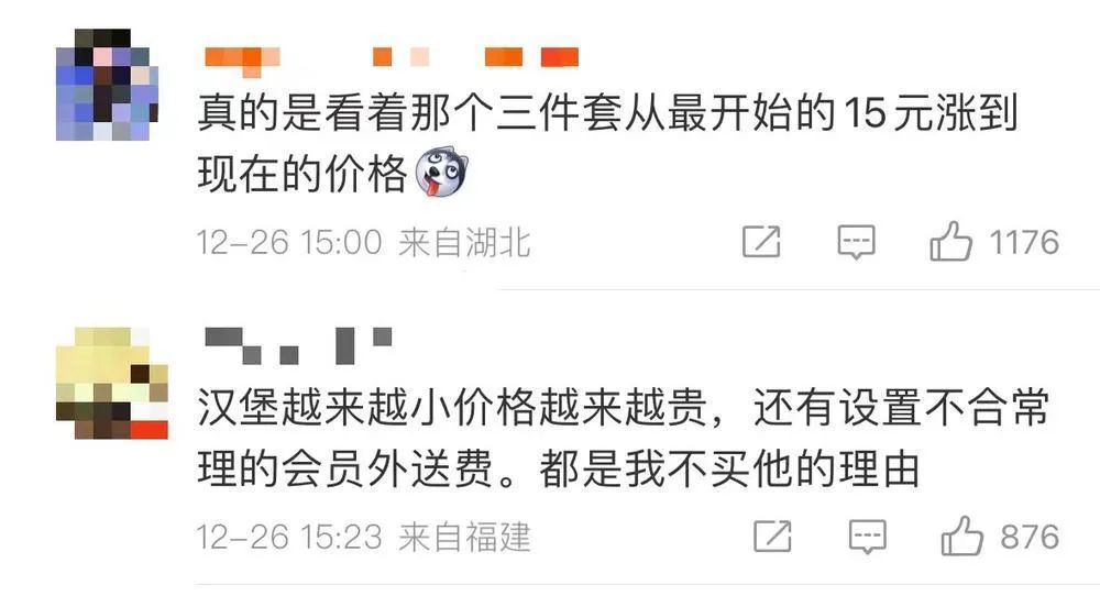 虽然此次麦当劳涨价,产品涨幅普遍在0.5元-1元之间,但“麦当劳涨价”“麦当劳一年内两次涨价”等话题依然被推上热搜。截至12月27日下午,麦当劳涨价的相关话题依然在微博热搜之上。